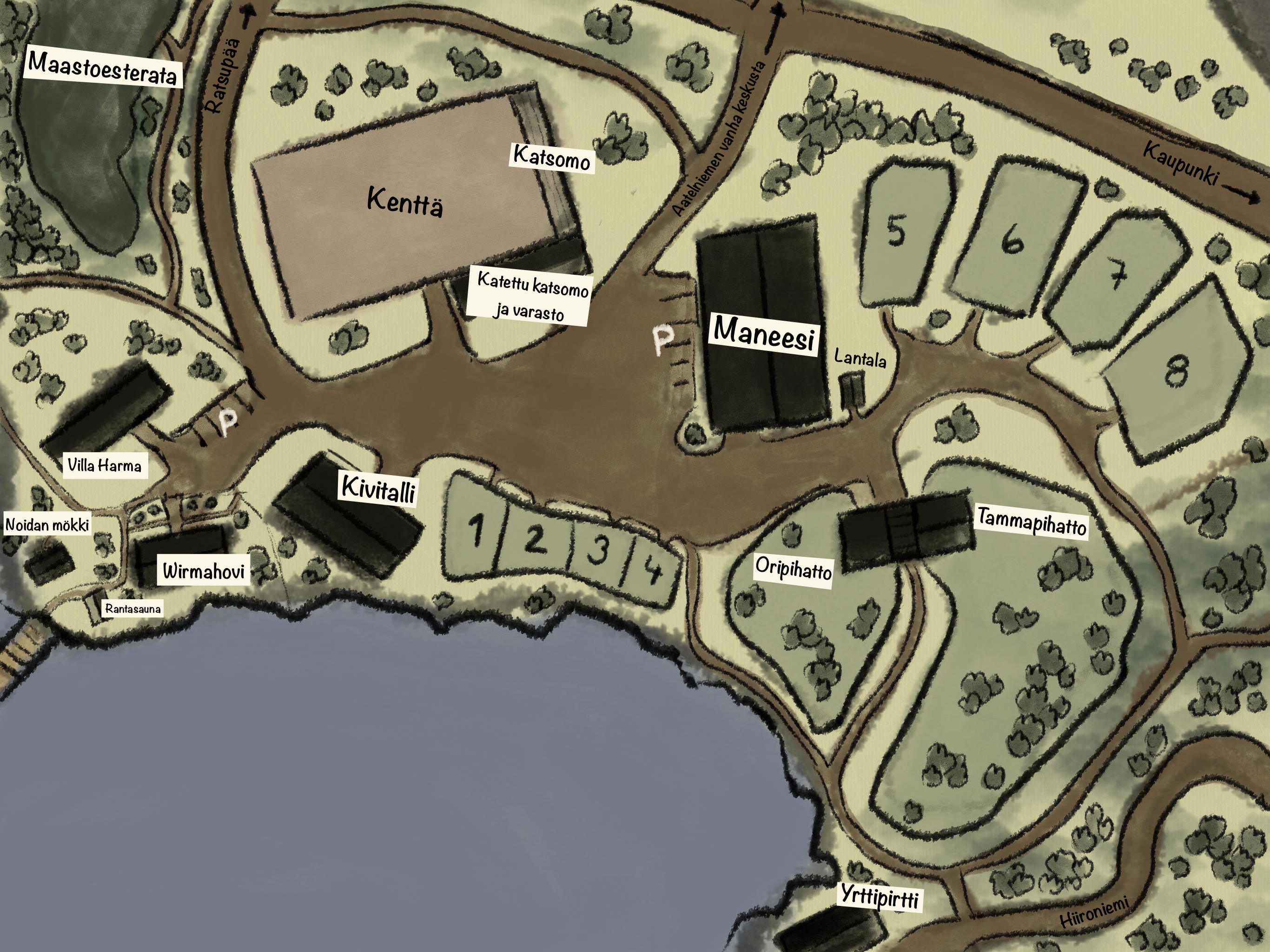 Kartanon maastoesterata kulkee läpi peltojen ja metsien, tarjoten vaihtelevaa maastoa ja luonnonmateriaaleista rakennettuja esteitä. Lisäksi kartanon laajat maastoreitit tarjoavat monipuolisia ratsastusmahdollisuuksia niin kokeneille ratsastajille kuin aloittelijoillekin.