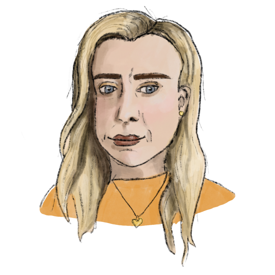 ratsastuksen ja perhe-elämän välillä. Hänellä on punaiseksi värjätyt hiukset, vahvat kulmakarvat ja napakka