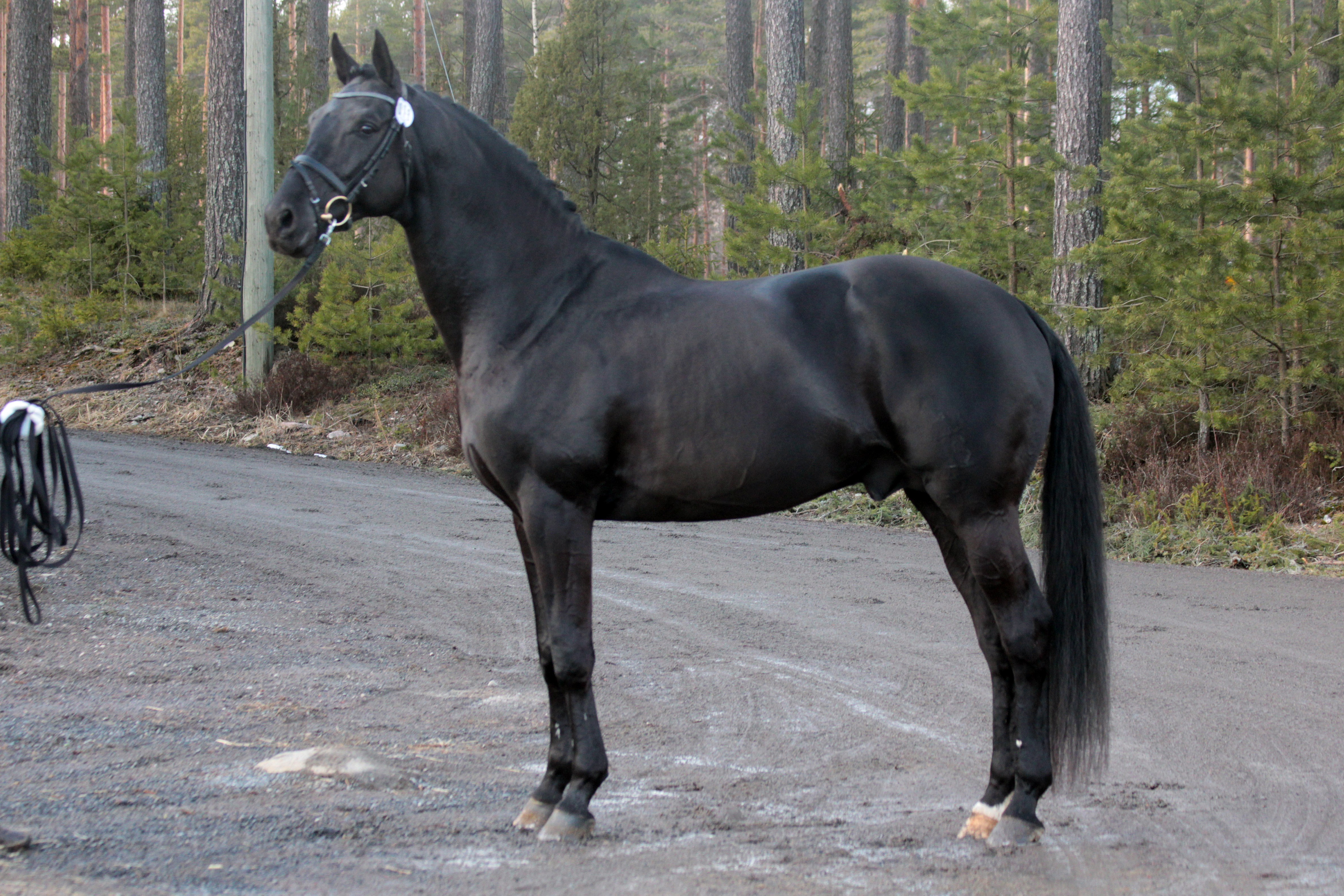Saavuin puolenpäivän aikaan Hukkapuroon, sillä tarkoituksena oli tänään puuhastella Late-nimisen orin kanssa. Tapasin Otterleyn tallissa ja hän vei minut suoraan komean ja mustan puoliverin luokse. Harjapakki olikin jo valmiina karsinan vieressä, joten aukaisin karsinan ovea ja annoin orin tutustua minuun rauhassa. Kun ori oli saanut tutustuttua minuun, otin harjapakista harjan ja aloin harjaamaan komeaa oria. Kuulemma minulla ei ollut mikään kiire ratsastamaan Latella, joten päätinkin harjata orin oikein perinpohjaisesti ja samalla tutustua tähän. Ori oli nyt harjattu sekä kaviot putsattu, joten lähdin hakemaan suitsia ja satulaa. Ori oli helppo satuloida ja pian olimme valmiita lähtemään ratsastamaan.